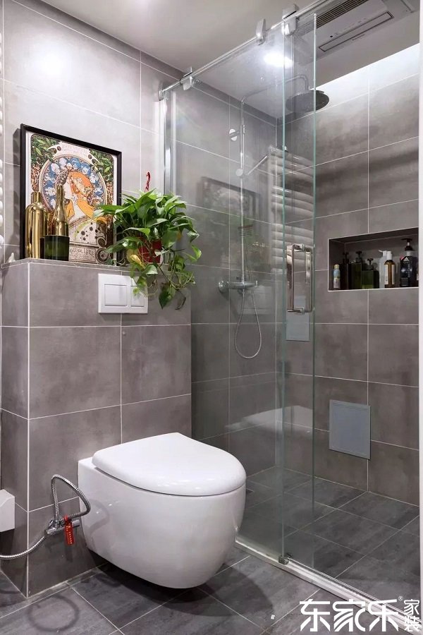 干濕分離的設計,保證了空間的整潔與清爽,墻壁上人性化的空出一個小空間來擺放潔具用品,以原生的元素解決了收納問題。