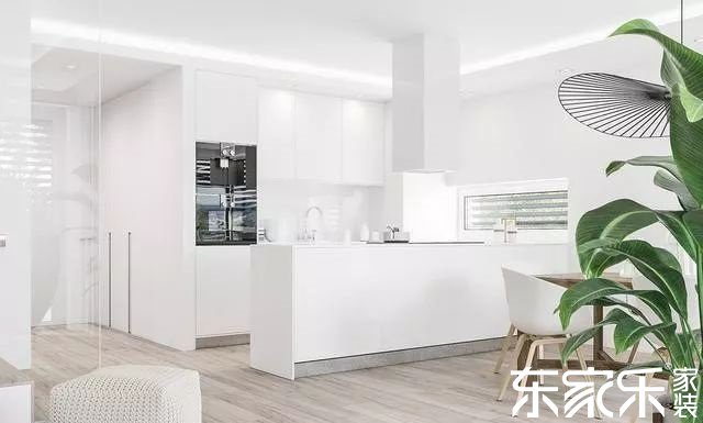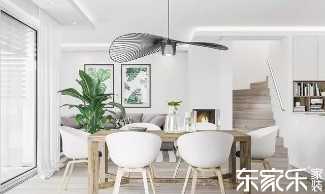 造型感強烈的現代風格吊燈在餐廳的空間尤為搶眼,北歐風的特點就是簡單和舒適,開放式廚房和餐桌部分都選擇了大面積的白色,搭配現代風格的原木色家具,細節滿滿。