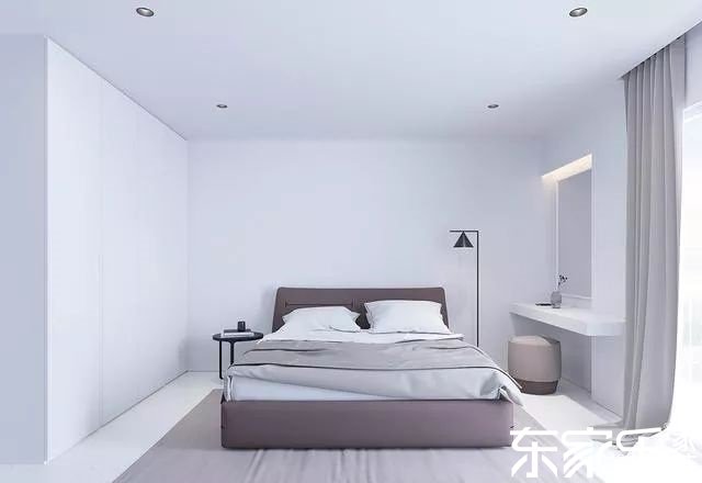 落地床頭燈和簡約床頭柜造型利落,是這無盡白色空間的恰好點綴,這無盡的白是夜里寧靜的睡夢