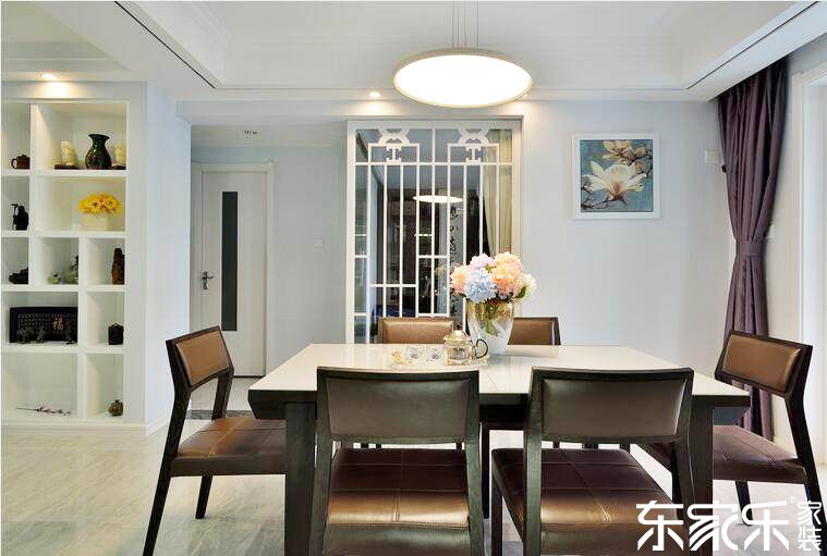 餐廳白色的墻面、白色的餐桌搭配深色軟包餐椅,中式隔斷配上藍底白花掛畫顯得比較儒雅。