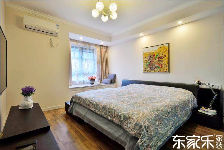 主臥室以灰色和白色為主色調,搭配黃色和紫色的軟裝,看起來也是生動充滿活力。乳白色的墻體與原木色的木地板增加了空間的舒適度,黃色的裝飾畫和紫色的薰衣草裝飾花則豐富了空間的色彩。